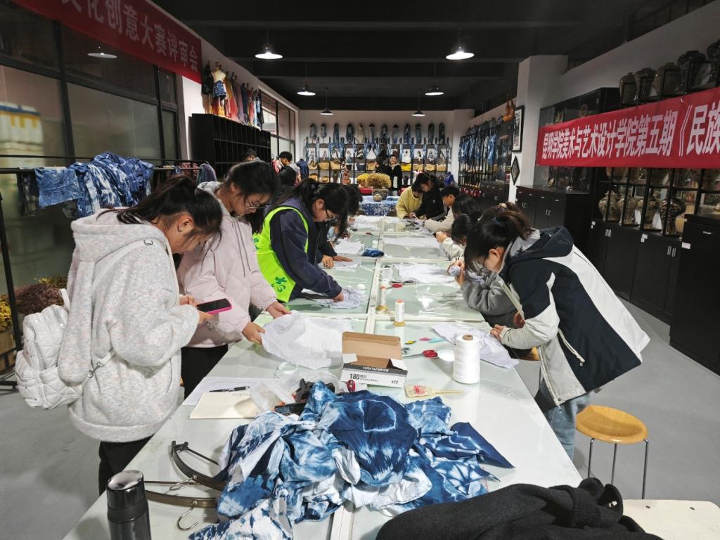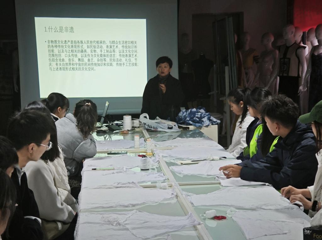 扎染研习由美术与艺术设计学院的蒋群老师授课,首先她从非遗的概念入手,详细阐述了非遗的重要性和保护意义。然后,巧妙地引出少数民族扎染技艺,向学员们展示了这项技艺的独特魅力和深厚底蕴。她结合生动的案例和丰富的图片,将扎染的发展历程和制作技艺娓娓道来,详细讲解了扎染的历史、材料、技法等内容。除了理论知识的讲解,蒋群老师还特别开设了扎染的实践操作环节。她亲自示范,详细讲解了扎染的步骤和流程,并手把手指导学员们进行染织技巧的实践。学员们纷纷动手尝试,他们或绑线、或浸染,每个人都沉浸在创作的乐趣中。
