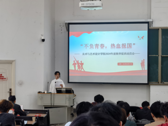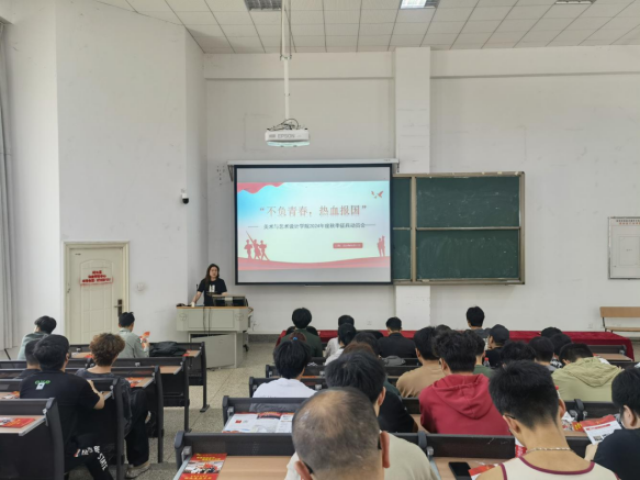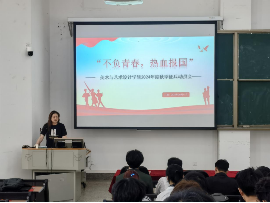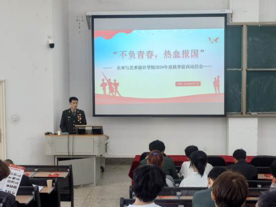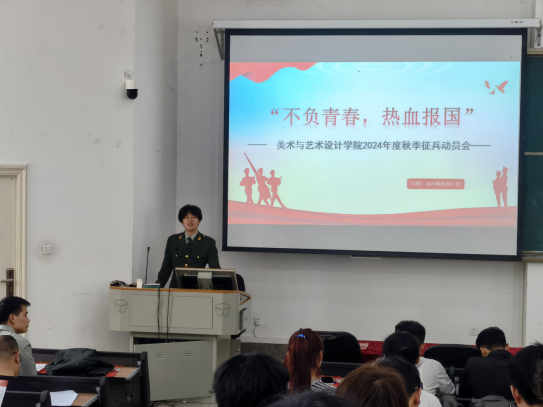 为鼓励和引导青年学生积极响应祖国号召,投身军营、献身国防,激发大学生从军报国的理想追求,5月17日中午,美术与艺术设计学院在美术楼报告厅召开2024年秋季征兵动员大会。学院党委张晓鸥副书记主持会议并作动员讲话,学校武装部缪希松副部长讲解相关政策,2024届毕业班全体男生及其余年级有入伍意愿的同学参加会议。