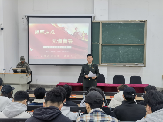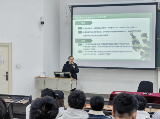 为鼓励和引导青年学生积极响应祖国号召,投身军营、献身国防,激发大学生从军报国的理想追求,12月13日中午,学院召开2025年春季征兵动员大会。学院党委张晓鸥副书记主持会议并作动员讲话,学校武装部缪希松副部长讲解相关政策,2025届毕业班全体男生及其余有入伍意愿的同学参加会议。
